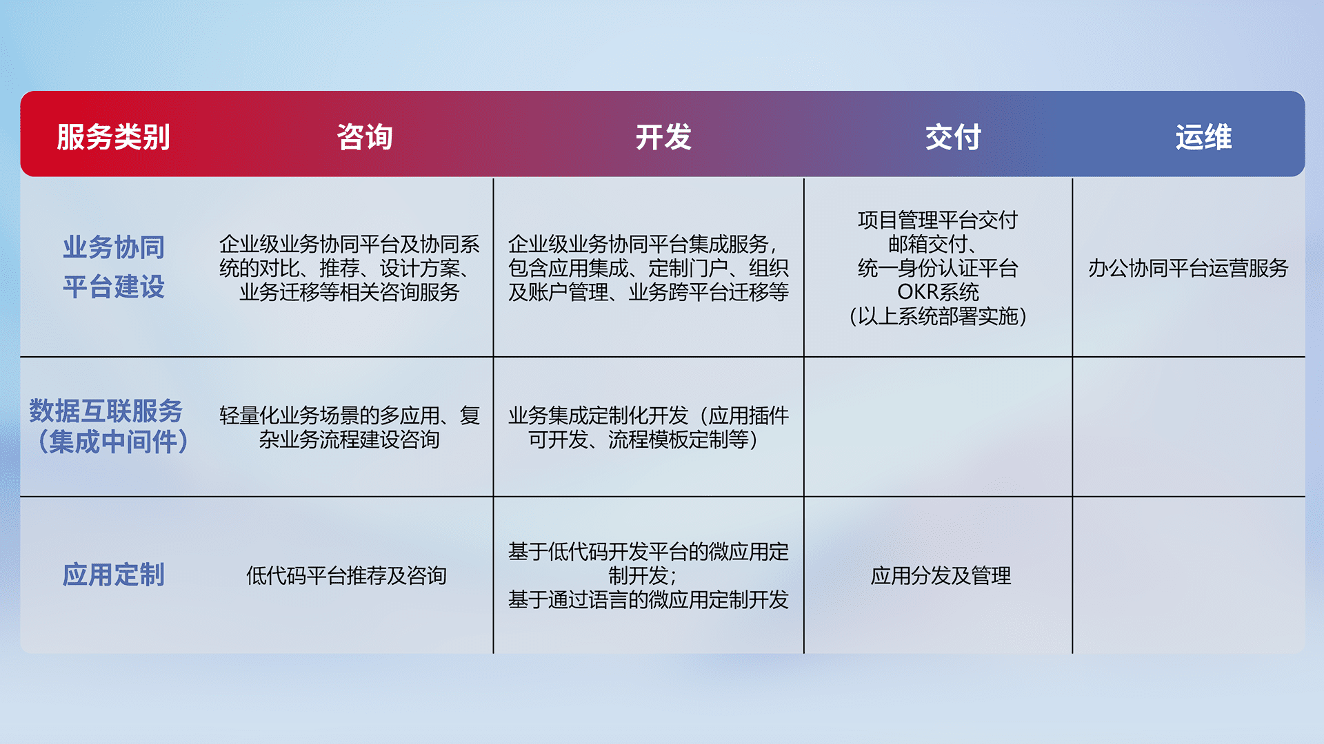 针对钉钉、、、、企微、、IDaas等平台级产品提供产品的规划、、方案、、交付、、、、定制化开发等服务,,,,实现如统一协同办公、、、、智能客户服务、、混合会议管理、、、智能数据查询、、、等业务场景,,,,实现数字化转型。。。。