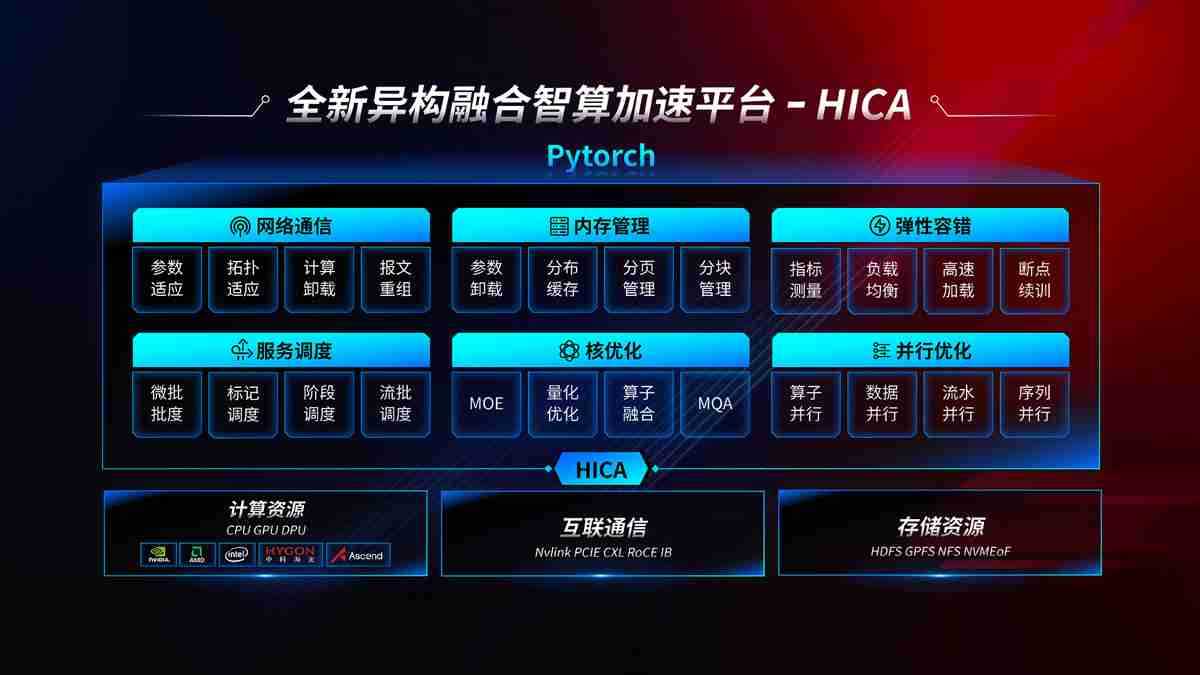 通过自研的服务层、、、中间适配层、、以及调度编排算法,,,,采用数据并行、、、模型并行等多种并行方式,,,,把并行计算任务进行有效的分解,,,使其分别由相应的软件栈和算力资源来承接。。。当GPU资源变化,,,HICA可以实时动态调度计算子任务并调整模型拓扑和架构,,以充分聚合各种算力资源。。。