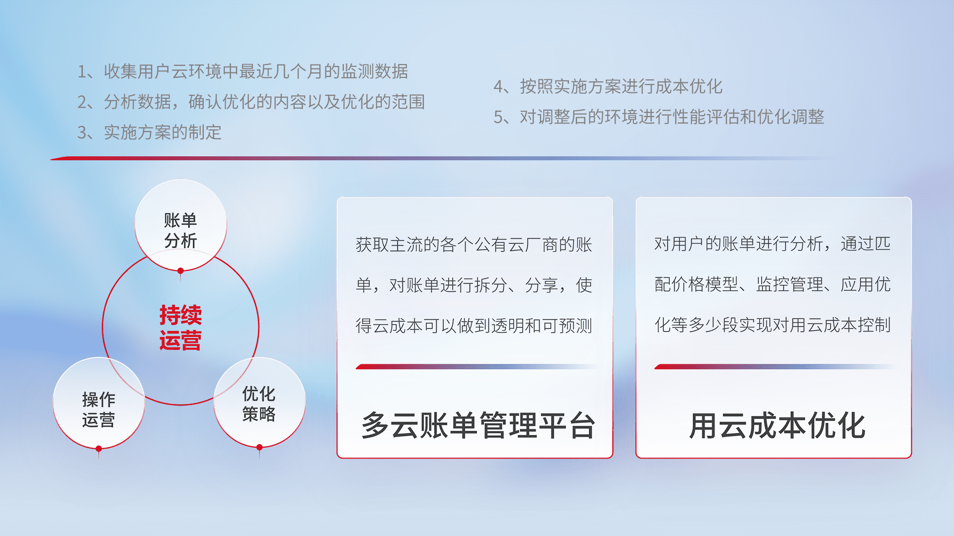 通过多云纳管,,以统一的资源数据模型把客户的云资源进行抽象和封装,,,,进而实现对多云资源的统一操作,,,保障云资源管理的可靠性、、稳定性与可用性。。。。量身定制化运维内容,,,配置、、、、开发运维、、、、补丁管理、、备份、、、监控、、、认证和访问管理、、审计和日常巡检等,,,保障在用云过程中的可靠度,,稳定度以及高可用率。。。。