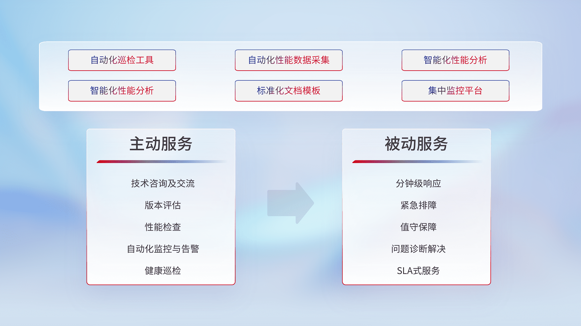 智能化工具和标准化文档,,保障服务质量,,提供主动服务(包含技术咨询、、、、版本评估、、、性能检查、、、、自动化监控与告警、、、健康巡检)和被动服务包含(分钟级响应、、、紧急排障、、、值守保障、、、、问题诊断解决、、、SLA服务)。。